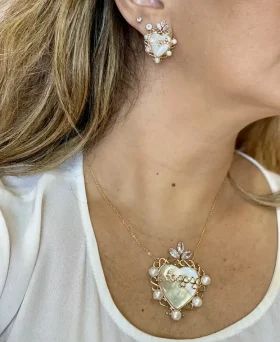 madrepérola e pérolas shell, flores com zircônias brancas e cristais navetes