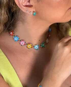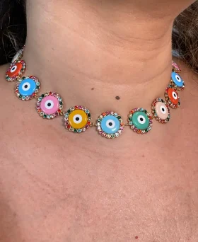 • CHOKER ESMALTADA COLORIDO OLHO GREGO, ZIRCÔNIAS E MADREPEROLA COM BANH