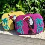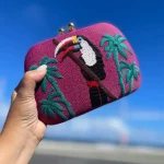 Esta clutch deslumbrante com estampa de tucano é a peça perfeita para adicionar um toque tropical ao seu guarda-roupa. Com um fundo rosa vibrante e detalhes bordados, ela é ideal para eventos diurnos ou noturnos, conferindo um charme especial ao seu look. Combine esta clutch com vestidos leves e acessórios dourados para um visual coeso e elegante.